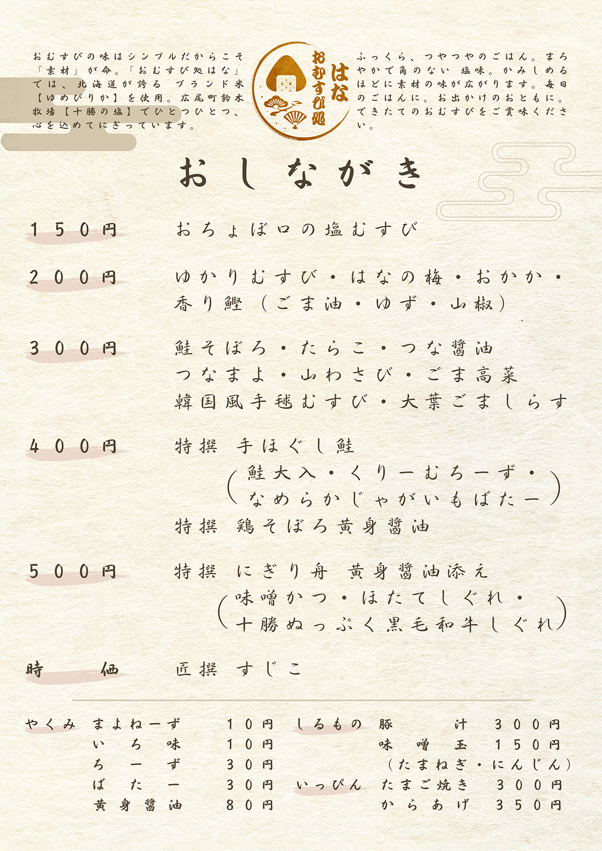 ふっくら炊き上げた国産米に、厳選された具材をぎゅっと包み込んだ、どこか懐かしくて新しいおむすび。毎日食べたくなる優しい味を心を込めた手むすびでご提供しています。